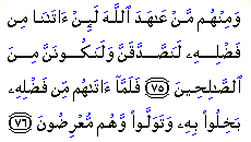 (The Repentance) Some of the hypocrites pledge solemnly to God that if He would bestow His grace on them and give them some of His bounty, they would be very charitable to the poor and behave in the way expected of righteous people. Such a pledge, however, is given at a time when those people are poor, when their poverty makes them yearn for a time of plenty. Yet when God answers their prayers, and favours them with His bounty, they forget all about their pledges, and behave like misers. This violation of their promises and lying to God make hypocrisy take root in their hearts. Hence they continue to be hypocrites until they die. Human beings are weak and niggardly, except for the few who manage, by God's grace, to elevate themselves. They cannot rid themselves of their miserliness unless their hearts become full of faith, raising them above the needs of this world and freeing them of their eagerness to protect their immediate interests. This is easy if they hope to achieve something better in the hereafter, and aspire to receive God's acceptance, which is far superior to all comforts and enjoyments. When a person's heart is devoid of true faith, his natural instinct to keep his wealth for himself is aroused whenever he is called upon to give in charity or to spend something for God's cause. The fear of poverty overrides his weaker desire to respond to such a call. He is imprisoned within his niggardliness, feeling insecure. A person who make a pledge to God and then reneges on his pledge and lies to God is not free from hypocrisy. Hence their deliberately unfulfilled pledges and their repeated lies breed hypocrisy which settles permanently in their hearts. A believer's heart is reassured by faith, does not fear to be poor as a result of spending in charity for God's cause, because he knows that what people may have will be exhausted and what God has in store is inexhaustible. His knowledge motivates him to pay in furthering God's cause willingly, without any fear that he will be left in need. Even if he becomes without money, what he hopes to receive from God is infinitely better and far greater. Source: |