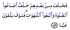 Negligence and abandoning Prayer are the very first step in a people's slide towards their decline. For Prayer is the primary link between man and God. Prayer keeps a person constantly in touch with God, during all hours of the day and night. Prayer prevents a person from moving away from a life of devotion, worship and obedience of Him. As soon as this bond is broken, man increasingly begins to draw away from God. This may even happen to such an extent that not only is man's relationship with God reduced to naught on a practical level but also on an intellectual level. It is for this reason that the Quran expounds here a general rule: that the corruption in a nation which originally followed a Prophet began the moment that nation abandoned Prayer. Following one's lust and desires rather than truth and justice naturally results from the weakening of one's God-consciousness. When a person becomes heedless of God and abandons Prayer, he comes increasingly into the grip of his own carnal desires. Eventually, he becomes impervious to all God's commands despite the fact that these had earlier shaped his morality and conduct. Instead, bit by bit, he begins to follow, all those ways which conform to his own likes and dislikes. Source: |