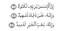 "Man is surely ungrateful to his Lord, and to this he himself bears witness; and truly, he is passionate in his love of wealth."
