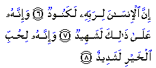 It is a fact that man reacts with ingratitude to all the bounties of his Lord. He denies the favours which Allah confers on him. His thanklessness and ingratitude is reflected in a host of actions and verbal statements which will serve as witness against him. Or perhaps, on the Day of Judgement, he may testify against himself, admitting his ingratitude: "and of this he himself is a witness". For on the Day of Judgement he will speak the plain truth even against himself, without any contentions or excuses. "And truly, he is passionate in his love for worldly riches". Man is a passionate self-lover. But he loves only what he imagines to be good for him: wealth, power and the pleasures of this world. This is his nature unless he has faith which changes his concepts, values and even his concerns. Faith changes his ingratitude to humble thankfulness. It changes his greed and miserliness to benevolence and compassion. It makes him aware of the proper values which are worthy of being the object of ambition and hard competition. Indeed these are much more exalted than money, power and mundane pleasures. Man without faith is an ignoble creature having only trivial ambitions and petty concerns. However big his desires, however strong his ambitions and high his objectives may seem, he remains sunk in the cesspool of this earth, confined within the limits of this life, imprisoned in self. He cannot be freed or elevated except by an attachment to a world superior to this earth, extending beyond this life; a world which originates from Allah who is the First Being and returning to Allah the Eternal; a world into which this life and the life hereafter converge and which has no end. Source: |