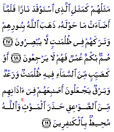 The first parable means that when a person, Muhammad (Allah's peace be upon him), spread the light of Truth that discriminated right from wrong and virtue from vice, those who used their faculties properly began to distinguish between these things. But the hypocrites, who were blinded by self-interest, could not see the right path even with the help of this light.
