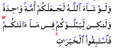 Individuals, innocent and free, have to make their choices (either to accept or to reject the Revelation); there will necessarily be diversity among people by the will of the Transcendent. The Revelation teaches that the purpose of these differences is to test us in order to discover what we are going to do with what has been revealed to us: the commandment in this verse is to use these differences to "compete in doing good." Diversity of religions, nations, and peoples is a test because it requires that we learn to manage difference. Differences might naturally lead to conflict: therefore, the responsibility of humankind is to make use of difference by establishing a relationship based on excelling one another in doing good. Knowing the other is a process that is unavoidable if fear of difference is to be overcome and mutual respect is to be attained. So human beings live a test that is necessary for their nature but that they can - and must - master by making the effort to know and recognize those who are not of their tribe, their country, their race, or their religion. Source: |