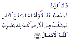 Allah's law entails that evil or scum cannot flourish for long. Were scum to last, it would pose a danger to the existence of all creatures in the world. By contrast to it is that which benefits mankind and that which lasts on earth.