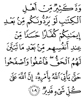 "Among the followers of the Book, many would wish that they could turn you back to infidelity after you have believed - because of their envy after the truth is manifest to them. But forgive and overlook until God accomplishes His purpose; for Allah has power over all things."
