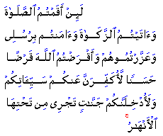 God does not give His blessings as a personal favour or a personal gift. This comes only after its conditions are fulfilled. This was true in this particular covenant God made with the Children of Israel. The first condition was to attend to prayer. This is more than merely offering prayers. It means that prayers should become a manifestation of a true relationship between man and his Lord. Second was charitable payment, in recognition of God's favour for having given us what we have and by way of acknowledgement of the fact that whatever we may own actually belongs to God. The next condition was to believe in God's Messengers making no distinction between them. Every single one of them was sent by God to preach the same message. In addition to zakat, giving generously to support God's cause is mentioned as a loan given to God. Since God has promised to return to man every penny that he spends in His way along with His reward, which will be several-fold, the Quran characterizes this spending as a loan to God. To forgive someone's evil deeds signifies two things: