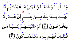Throughout the history the ignorant always blamed God's Will to cover up their deviation and error. They argued that their worshipping of idols and angels became possible only because Allah allowed them to do so. Had He not willed so they could not have done it; and then it had been a practice with them for centuries and no torment from Allah had descended on them, which meant that Allah did not disapprove of their practice. This argument, however, is wrong. For it is not only shirk which is being committed in the world, but countless other crimes like stealing, robbery, murder, bribery, etc. also are taking place, which nobody likes. Then, can it be said by the same reasoning that all such acts are lawful and good only because Allah is letting them happen in His world, and when He allows them to happen, He must have approved of them also? The means of knowing what Allah likes and what He hates are not the events that are happening in the world, but the Book of Allah, which comes through His Messenger and in which Allah Himself states as to what beliefs, what deeds and what morals He likes and what He dislikes. If these people have a Book, which came before the Quran, and which tells that Allah has appointed the angels and idols also as deities beside himself and that they should worship them also, they should cite it. The truth is that they have no authority of any divine book; the only authority they have is that it has been the practice since the time of their forefathers. Source: |
