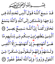 "God has heard the words of she who disputes with you regarding her husband and made her complaint to God. God hears your conversation. Verily God is All-Hearing, All-Seeing. Those of you who shun their wives by zihar - they are not their mothers. Their  mothers are only those women who gave birth to them. Indeed they utter words that are unjust and false; but God is Absolving of Sins, All-Forgiving."