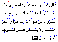 Qarun, however, did not appreciate the blessings granted by his Lord. He did not abide by the divine method, but instead turned away arrogantly. Therefore, a warning was issued to him for his insolence and arrogance: If he believed himself to be powerful and rich, God had in the past destroyed communities that were far more powerful and wealthy. He should have known this, because it is such knowledge that saves man from destruction. Let him know, then, that he and all guilty people like him are worth nothing in God's sight. They are not even worth questioning about their sins. They are neither the arbiters nor the witnesses.