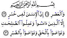 "By the flight of time, man is in total loss. Except for those who have faith and do good works; who exhort each other to uphold the truth and to perseverance."