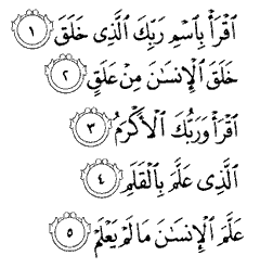 "Read! In the name of your Lord and Cherisher, Who created. Created man, out of a leech-like clot. Proclaim! And your Lord is Most Bountiful. He Who taught [the use of] the Pen, Taught man that which he knew not."