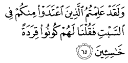 "And you are well aware of those amongst you who violated the Divine law in the matter of the Sabbath, so We said to them: 'Be you apes despicable.'"
