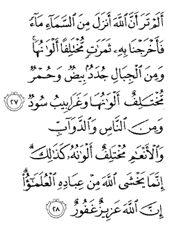 "Are you not aware that God sends down water from the skies, with which We bring forth fruits of different colours? In the mountains, there are streaks of white and red of various shades, as well as others jet-black. Similarly, human beings, beasts and cattle have various colours. It is those who are endowed with knowledge that stand truly in awe of God. Indeed, God is Almighty, Much-Forgiving."