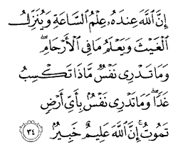 "Truly with God lies knowledge of the Hour, and He sends down the rain and knows what lies in wombs. And no soul knows what it will earn on the morrow, and no soul knows in what land it will die. Truly God is Knowing, Aware."